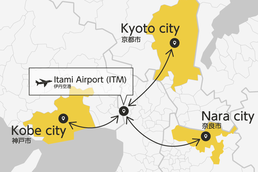 Itami Airport, the largest domestic airport in Kansai, is just a 30-40 minute drive from downtown Osaka. It offers easy access to major cities like Tokyo and Fukuoka, making it a convenient choice for travel. We offer transfers between Itami Airport and key Kansai cities like Osaka, Kyoto, Nara, and Kobe.