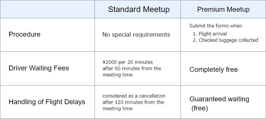 On the other hand, with the premium meetup service, by submitting two forms, you can avoid waiting fees and the risk of the driver not waiting for you.