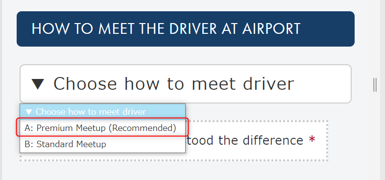 When applying for our airport pickup service, there is an option called “How to meet the driver.” You can choose either Standard Meetup or Premium Meetup. Please select Premium Meetup at that time.